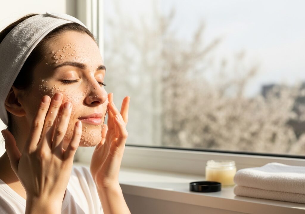 Dead skin cells build up over winter. A gentle exfoliating scrub 2,3 times per week removes that layer and reveals fresh, glowing skin underneath.
