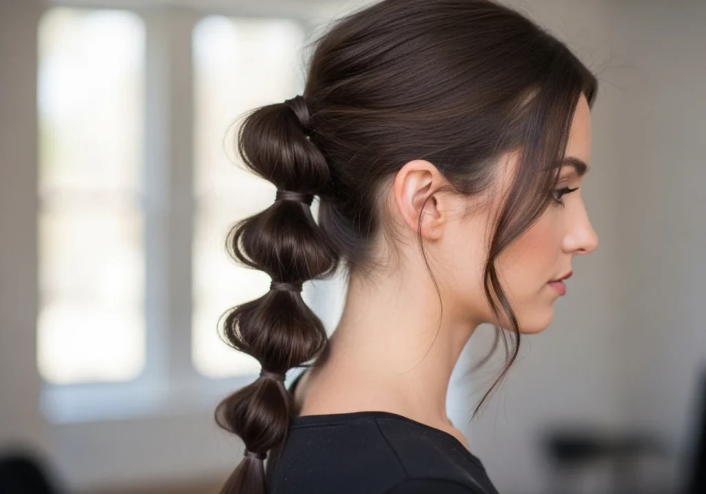 Section your ponytail with multiple elastics evenly spaced, then gently puff out each section. It’s playful, modern, and surprisingly easy.