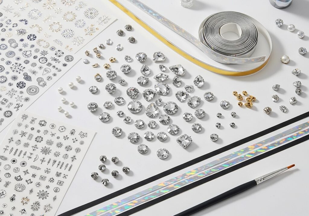 - Rhinestones & Gems Stick them on wet top coat for an instant glam look. No skill required!