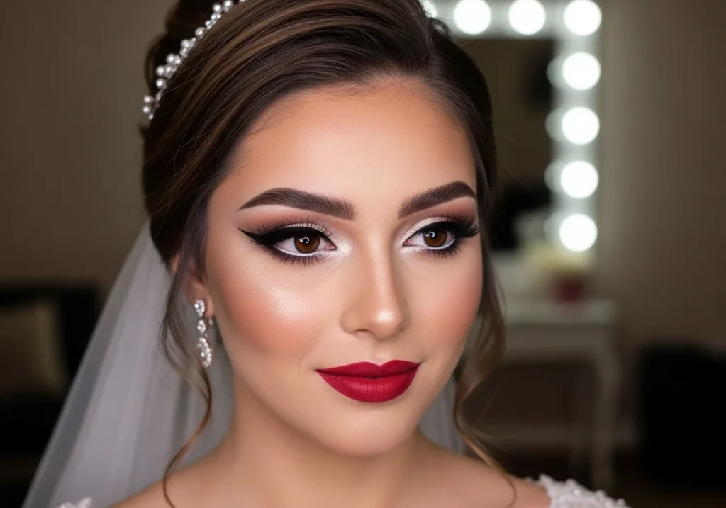 Full glam bridal makeup uses a flawless full-coverage base, dramatic eye makeup with liner and lashes, bold contour, and a statement lip. This style commands attention and suits evening receptions, banquet halls, and brides who love high-impact beauty.